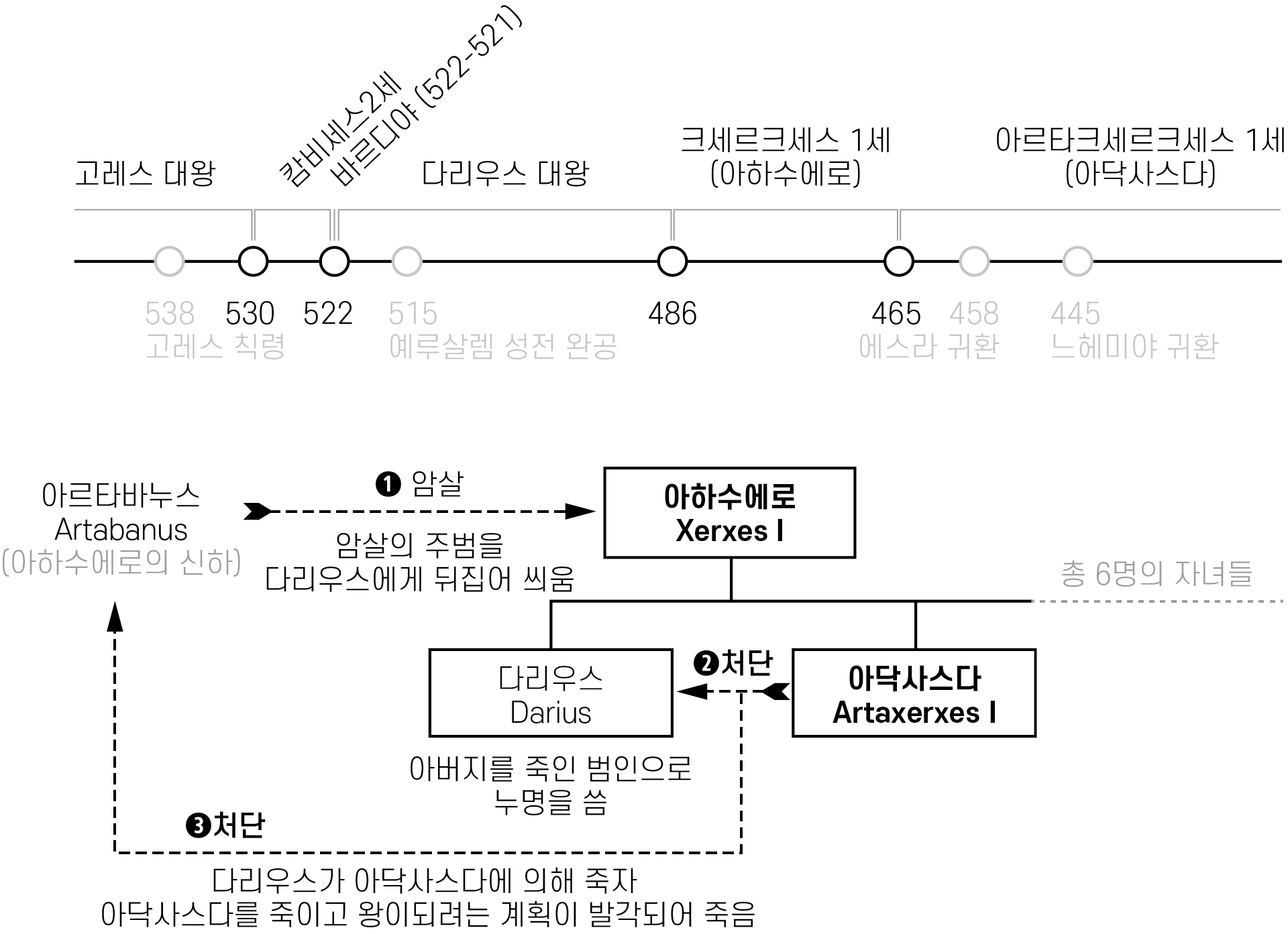 아닥사스다의 아버지는 아하수에로(크세르크세스 Xerxes I, 486-465 BCE)였습니다. 아하수에로는 페르시아의 위대한 왕이자 동시에 제2차 페르시아-그리스 전쟁의 패배자이지요. 패배한 왕 아하수에로에 대해 불만을 가진 신하 아르타바누스(Artabanus)가 아하수에로를 암살하였습니다. 그리고서는 아하수에로의 아들 다리우스가 아버지를 죽였노라고 소문을 퍼뜨리기 시작했어요.