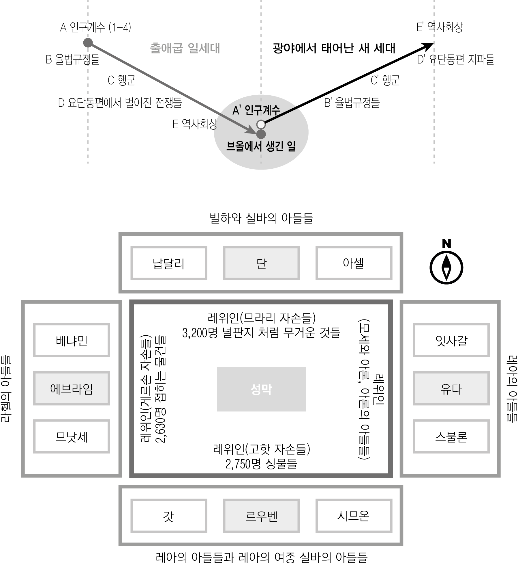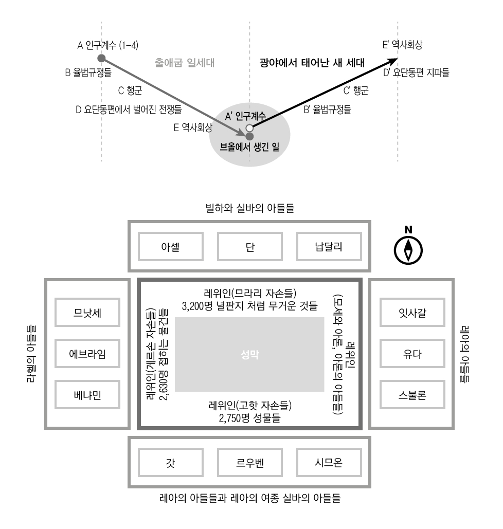 - 본문의 내용에서 광야에 진을 친 각 지파의 위치를 수정하였습니다. 이 그림은 단지 열두 지파와 레위인들의 위치를 시각적으로 보여주는 그림이므로, 본문의 내용과는 관련이 없기 때문에 크게 신경쓰지 않으셔도 되겠습니다. 하지만, 정진기님의 질문을 통해서 제가 쓴 글을 다시한번 읽고, 제가 그린 그림을 다시한번 검토할 수 있게 되어서 얼마나 감사한지 모릅니다. 이 수정은 정진기님의 질문이 있었기 때문에 가능했습니다. 감사드립니다.