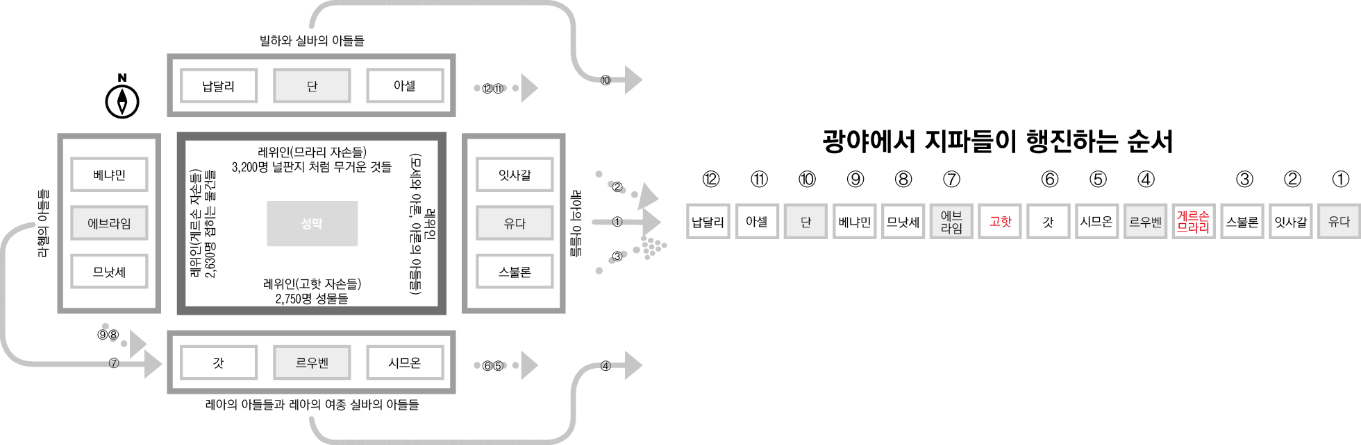 - 만약에 반드시 진영의 기를 든 지파가 가운데 위치할 필요가 없다고 한다면, 아래와 같은 배치도 가능합니다. 오히려 지파들이 행진을 위해서 진행을 하는데 더욱 매끄럽게 움직일 수 있습니다.