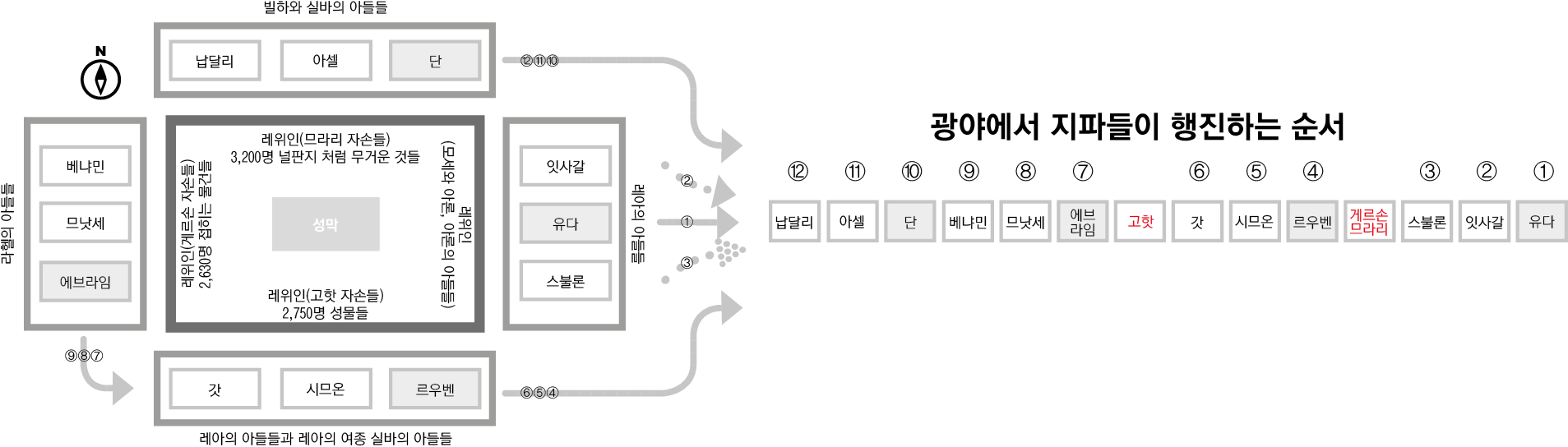 - 구성의 원리는 아래의 그림과 같습니다. 지파들이 배치할 때에 군기를 든 지파들은 진영의 한 가운데에 자리잡게 했습니다. 그리고 광야에서 지파들이 행진을 하는 순서를 기준으로 지파들이 이동을 할 때에 서로 진행에 방해가 되지 않도록 진을 구성했습니다.