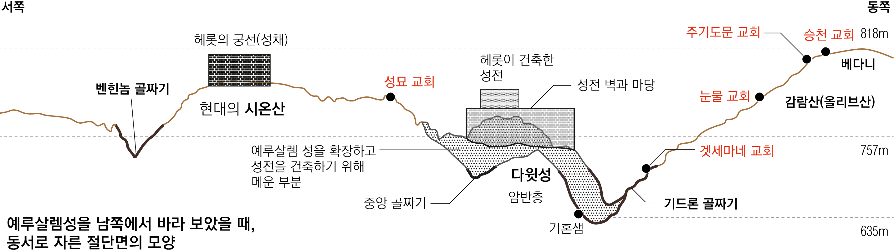 예루살렘 성을 중심으로 서쪽은 벤힌놈 골짜기, 동쪽은 기드론 골짜기, 그리고 기드론 골짜기를 가운데 두고 예루살렘성과 감람산(올리브산)이 잇대어 있습니다. 감람산 자락에는 겟세마네와 베다니, 벳바게가 있는데요. 성경에서는 그저 지명만 나오기 때문에 어디가 어디인지 모르실 겁니다. 그리고 지도도 하늘 위에서 아래를 내려다 보기 때문에 지형의 높고 낮음을 알 수가 없지요. 그래서 예루살렘성과 감람산을 동서로 잘라서 그 높이의 차이와 주요한 구조물과 위치를 표시해 놓았습니다.