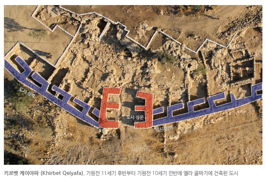 2008년에 히브리대학교 가핀켈(Garfinkel) 교수가 다윗과 골리앗의 전장(삼상 17)이었던 엘라 골짜기의 한 언덕을 발굴하기 시작했습니다. 대부분의 이스라엘 도시는 수 세기에 걸쳐서 마을이 계속되었기 때문에 “텔”(Tel)이라고 불리는 작은 인공 언덕의 형상을 가지고 있습니다. 그러나 이 언덕의 도시는 아주 독특하게 단 한 시대에만 사람들이 마을을 이루고 살았고, 곧 버려졌습니다. 텔이 아닌 것이지요. 그곳에서 발견된 유물들을 연구하면서 알게된 것은 그 마을이 있었던 시기가 기원전 11세기 후반에서 10세기 중반(1050-970BCE: 성경에서 사울-다윗의 시대)으로 아마 삼상 17:52에 나오는 “사아라임”(뜻. 두 개의 문)일 것이라는 것이예요. 도시를 둘러싸고 있는 4미터 두께의 성벽의 길이가 약 700미터에 달하고, 5톤 무게의 거석이 도시 성벽을 이루는 마름돌로 사용되었던 것으로 보아서 아마도 전쟁을 대비한 전진 기지의 역할을 하지 않았나 싶습니다. 그도 그럴 것이 불과 10킬로미터 떨어져 블레셋의 도시이자 골리앗의 도시인 가드가 있으니 말이지요. 아마 골리앗의 군대를 맞선 사울이 이끄는 이스라엘의 군대가 진을 꾸렸다면, 바로 이 곳이 아니었을까요? 확실하게 대답을 할 수는 없지만, 그보다도 더 중요한 사실이 이 도시의 발굴 이야기 속에 있습니다.