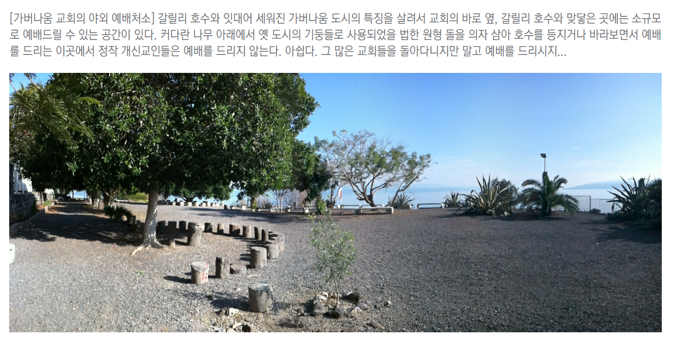이스라엘에서 1,500년의 역사가 넘은 많은 교회들을 다니면서 제가 느낀 것은 "이것이 정말 교회다!"입니다. 옛 교회의 모양을 그대로 갖추고 있는 교회가 있는가하면, 새로 건축된 그야말로 새 교회들도 여럿 있습니다. 2년 전 갈릴리 호수의 고라신 부근에 새롭게 프란체스칸 수도회에서 멋진 현대식 수양관과 성당을 건축했는데, 지날 때마다 드는 생각은 자연친화적이지 못하고, 갈릴리 주변의 아름다운 경관을 망치는 옥의 티라는 것입니다. 왜 그러냐고요? 너무나 현대식이어서 그렇습니다. 360도 돌아친 회색의 정방형 대리석 건물은 화려한 스테인 글라스만 없다면, 창고로 쓰기에 딱 좋다 싶어요. 제 생각이 그렇다는 것입니다. 반면에 가버나움에 새로 건축한 교회는, 똑같이 대리석으로 지어 올렸지만, 그 격이 다른 교회입니다.