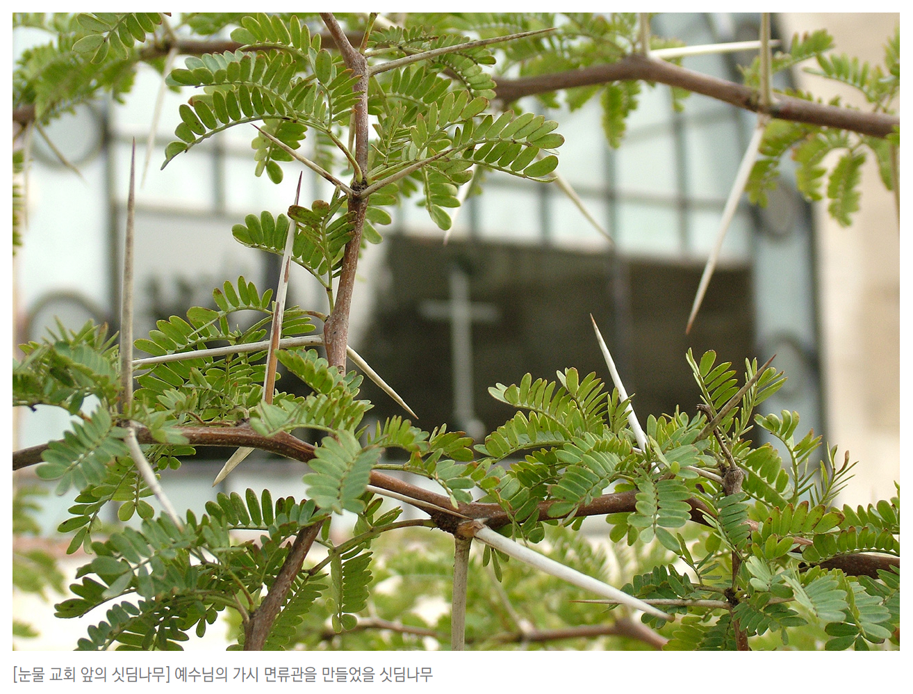 특별히 교회의 정중앙에 있는 옛 교회 바닥의 모자이크에서 제단의 십자가를 바라보면, 제단의 십자가가 정확하게 예수님께서 돌아가셨던 그 골고다에 맞추어집니다. 대부분의 사람들은 십자가를 이슬람의 모스크인 바위사원과 겹쳐놓고서는 기독교의 십자가가 이슬람의 사원을 이겼다고 사진을 찍기 일쑤지만, 그것은 단지 21세기의 십자군 정신일 뿐입니다. 원래 이 교회의 의도와는 관계가 없다는 거지요. 더욱 이 교회를 아름답게 만드는 것은 교회 바로 앞에 있는 싯딤나무(가시나무)입니다. 예수님의 가시 면류관을 만들었던 나무가 어떤 나무인지는 알 수가 없으나, 예루살렘 주변의 가장 흔한 가시나무를 꼽아보라면, 역시 이 싯딤나무입니다. 예수님의 고난을 기억하며 교회 앞에 심어놓은 이 가시나무와 교회의 십자가, 그리고 골고다가 만들어내는 엄숙한 그림 앞에서는 사진 찍기를 그만두고 기도했으면 좋겠습니다.