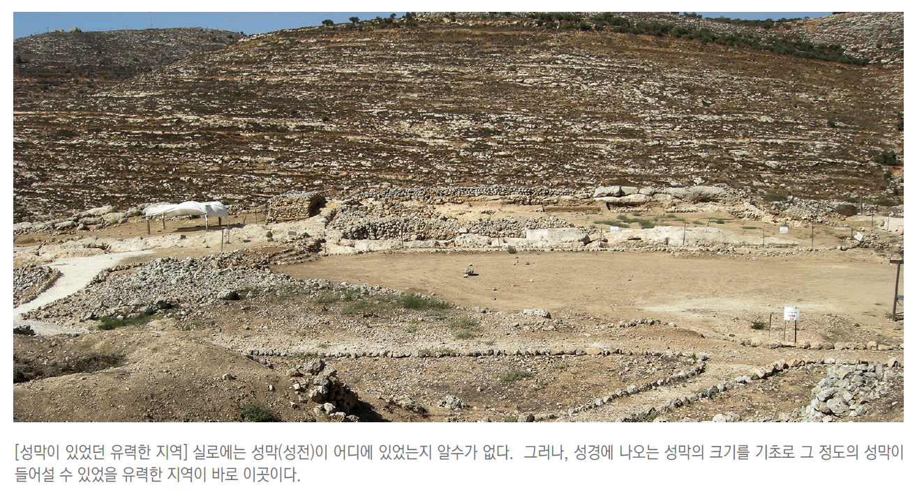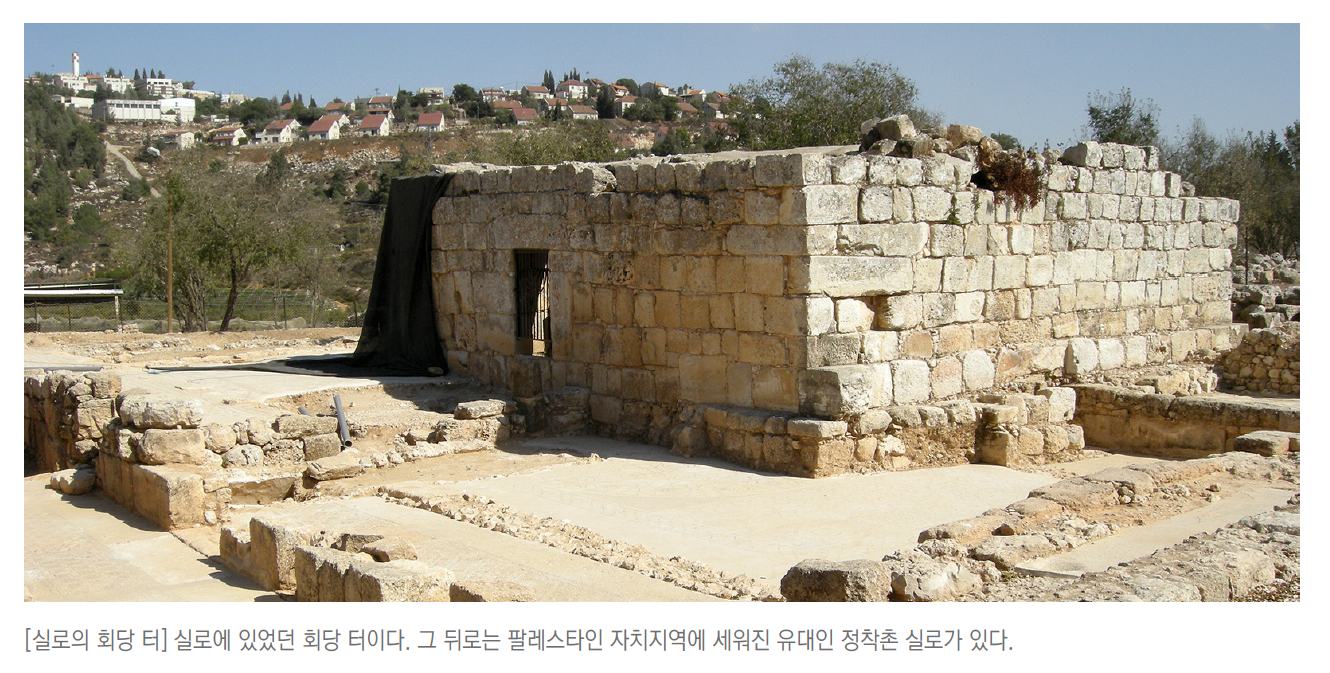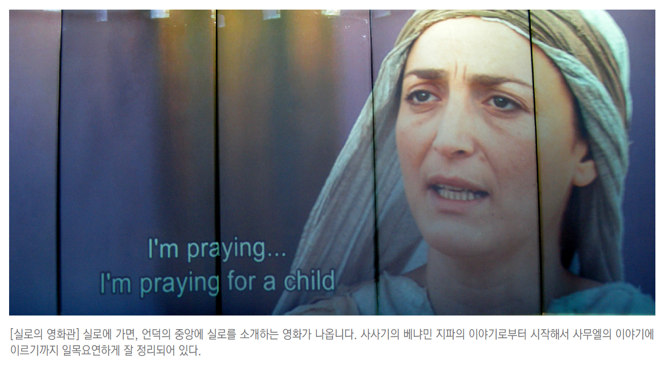 예전의 실로는 매년마다 하나님께 드리는 제사를 드리기 위해서 오는 사람들로 북적거리고, 날마다 드리는 제사로 끊임없이 연기가 피어오르던 분주한 곳이었지만, 지금의 실로는 국제법에 따르면 팔레스타인의 영토에 속해 있어 인적이 드문 곳입니다. 일찍이 이스라엘의 유대인들이 성서적으로 실로가 얼마나 중요한지를 알고서는 실로에 정착촌을 만들어서 옛 실로가 있던 곳을 보존하고 있습니다. 몇 년 전만 해도 실로에 가봤자 폐허뿐인 돌무더기만 가득했는데, 요즈음은 실로가 어떤 곳인지를 알리는 영상물과 그곳에 있었을 성전의 모형, 그리고 유세비우스 시절에 처음으로 세워졌던 교회의 터들을 발굴하는 작업으로 매우 분주하게 사람들이 오가는 모습이 있습니다. 아직까지 이전의 영화를 되찾았다고 하기에는 턱없이 부족하지만, 마치 새롭게 숨쉬기 시작하는 실로를 보는 듯합니다.