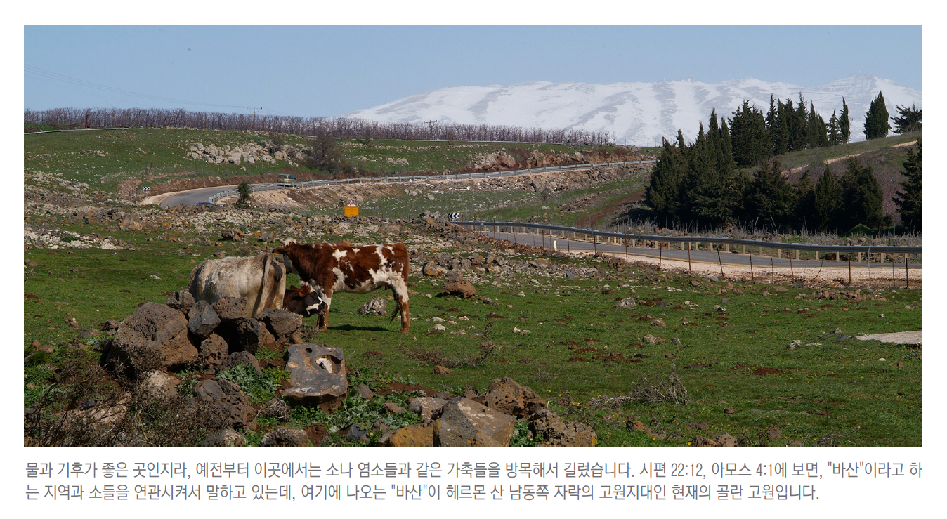 이 헤르몬 산은 지금과 같은 우기에는 눈이 많이 내려서, 이스라엘 유일의 스키장이 있는 곳입니다. 건기에는 워낙 고산지대인지라, 이슬이 많이 내려서 헤르몬 산 주변에서는 물에 대한 걱정이 전혀 없습니다. 물과 기후가 좋은 곳인지라, 예전부터 이곳에서는 소나 염소들과 같은 가축들을 방목해서 길렀습니다. 시편 22:12, 아모스 4:1에 보면, "바산"이라고 하는 지역과 소들을 연관시켜서 말하고 있는데, 여기에 나오는 바산이 헤르몬 산 남동쪽 자락의 고원지대인 현재의 골란 고원입니다.