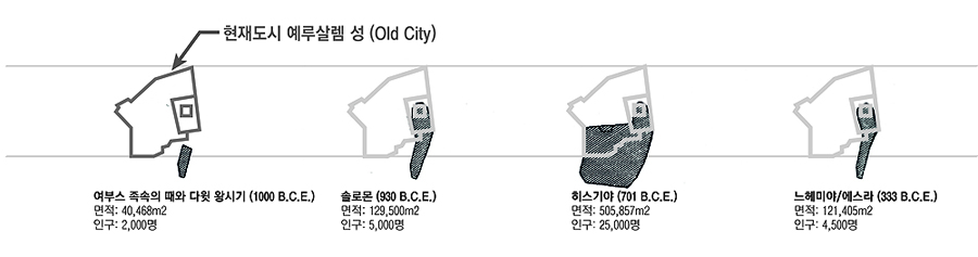 흑백으로 처리된 성벽은 다윗과 솔로몬 시대의 성이고, 컬러로 처리된 부분은 느헤미야가 재건한 성벽이다. 느헤미야가 성벽을 쌓을 때에 다윗시대의 성안 쪽 마을 조차도 다 둘러 쌀 수 없었다. 느헤미야의 성벽 재건은 그만큼 급박했다.