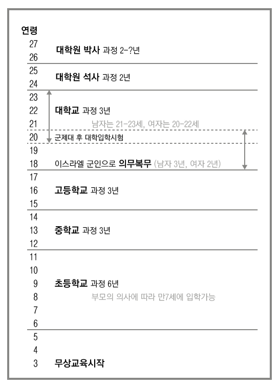 이스라엘의 교육제도는 세계 대부분의 나라의 교육제도와 비슷하면서도 군대라는 문화때문에 독특한 면이 있습니다. 이스라엘에서는 만 3세부터 무상교육이 시작됩니다. 그리고 만 6세에 초등학교에 입학을 합니다. 초등학교 6년, 중학교 3년, 고등학교 3년 과정은 우리나라와 동일하며, 우리나라와 마찬가지로, 고등학교까지가 무상교육이면서 의무교육입니다. 실업계 고등학교는 3년이나 4년간의 교육기간이 필요합니다. 보통의 경우 아이들이 실업계 고등학교를 선택할지 아닐지에 대해서 중학교 2학년부터 생각하게 되는데요, 그 이유는 실업계 학교에 따라서 중학교 3학년이 되는 때에 실업교육을 시작하는 분야가 있어서 그렇습니다. 독특한 것은 고등학교를 졸업하는 시험을 치루게 되는데 (Bagrut), 이 시험을 졸업할 때 치룰 수도 있고, 군대를 갔다와서 치룰 수도 있습니다.