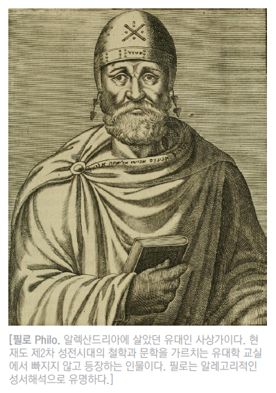 기원전 약 20년 경에 알렉산드리아에서 태어나서 기원후 40년에 사망한 이 유대인 철학자는 유대사상 Judaism을 그리스 철학을 바탕으로 설명하였던 사상가였습니다. 시대적으로도 예수님께서 공생애를 보내셨던 시기와 서로 일치하면서 필로에 대해서 연구한 신약학자들도 꽤 있었습니다. 다드 (C.H.Dodd)는 필로가 바울과 요한복음의 저자에게 영향을 주었다고 말할 정도였으니 말입니다. 기독교 세계에 필로가 더욱 유명해 진 이유는 De specialibus legibus (특별한 법)라는 책에서