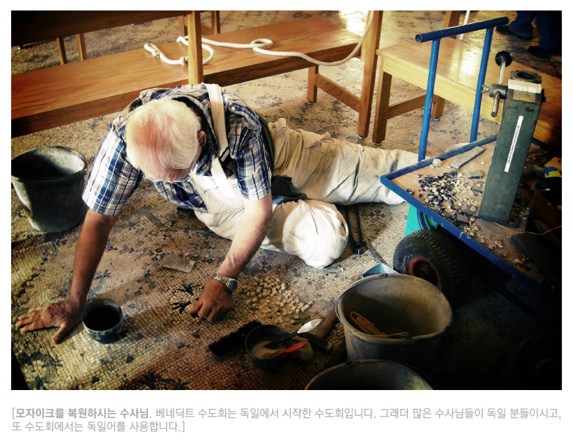 이스라엘에 사는 저나 성지순례에 오시는 순례객들이 무심코 밟으며 지나가는 이 교회의 바닥 모자이크들이 480CE의 것이라고 하면 다들 꽤나 놀라겠지요? 정말로 이 교회의 바닥 모자이크는 부분적으로 수리되고 있기는 하지만, 480CE에 교회가 확장되면서 만들어진 것들입니다. 그 중에 가장 유명한 모자이크는 광주리에 빵이 담겨있고 그 옆에 물고기가 있는 모자이크입니다. 기독교 서점이나 선물 용품점에서 한번쯤은 보셨을 그 모자이크 말입니다.