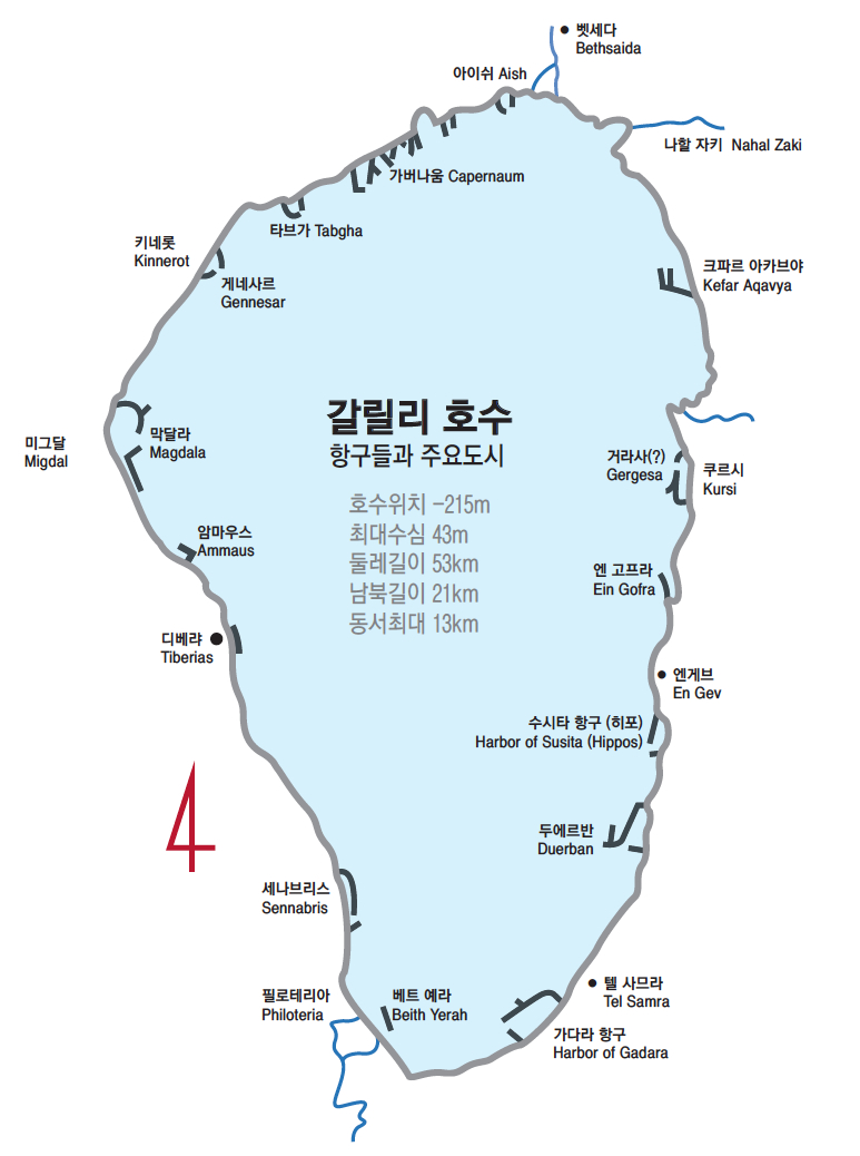 현재 갈릴리에는 4개의 항구가 있어서 관광객을 실어나르는 용도와 고기잡이의 용도로 사용되고 있지만, 예수님 시대에는 사람들이 방파제를 쌓아서 만든 15개의 인공항구와 1개 이상의 자연항구가 있었습니다. 약 16개의 항구 주변에는 사람들이 마을 이루고 살기 마련인데, 학자들마다 추정하는 인구의 수는 약간의 차이가 있지만, 대략 갈릴리 호수 주변에는 약 12,000명 정도의 사람들이 살았다고 하는군요. 예수님 당시 갈릴리 지역에서 가장 일반적인 직업은 어부였으니, 이 대부분의 사람들의 어업에 종사하거나, 어럽과 관련된 산업에 종사하였다고 추측하는 것도 무리는 아닌 것같습니다.