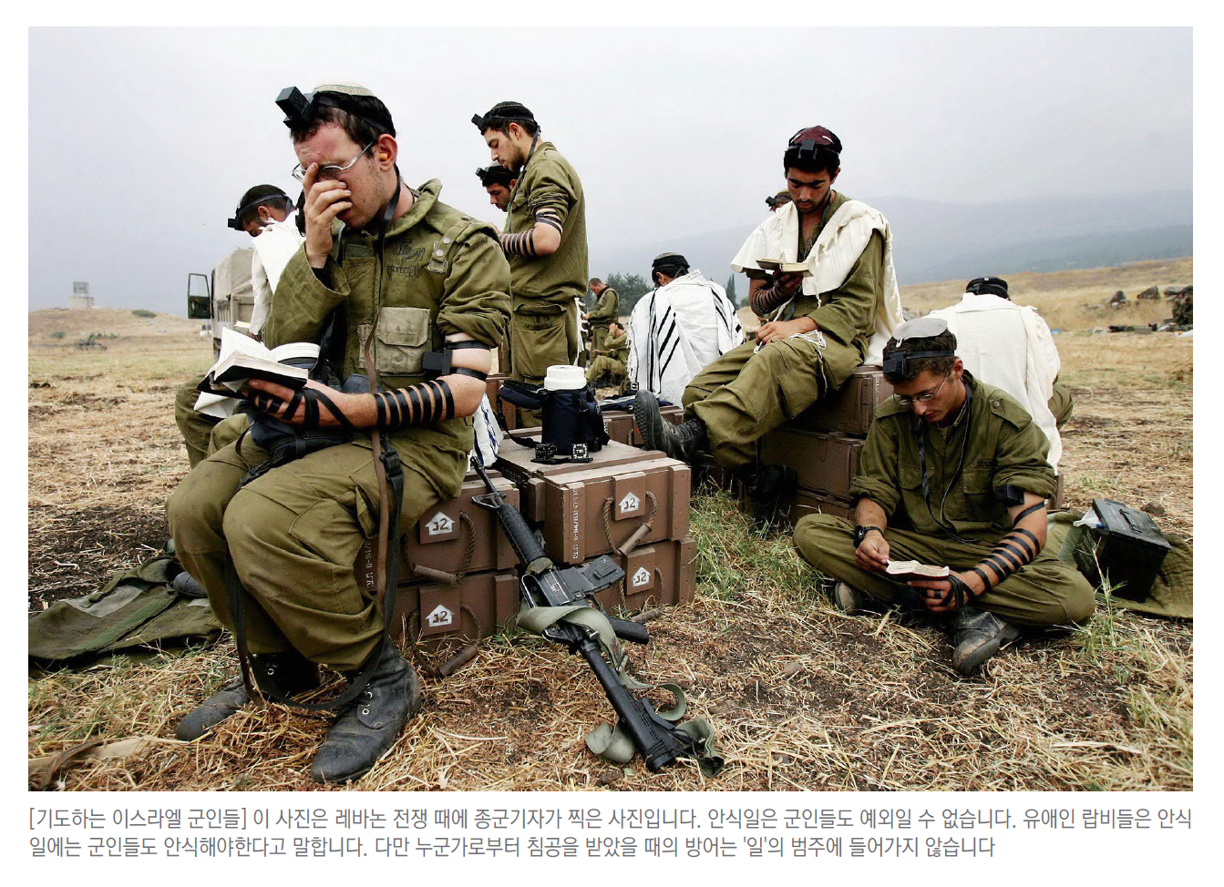 유대인들은 안식일을 매우 철저하게 지킵니다. 그래서 종종 안식일에 통곡의 벽을 순례하는 순례자들은 통곡의 벽 앞에서 사진을 찍으려다가 유대인 경찰들이나, 종교인들로부터 강력한 제제를 받기도 하지요. 왜냐하면 사진을 찍는 것은 '일'이기에 안식일에 아무 일도 하지 말라(레 23:3)는 하나님의 율법에 어긋나기 때문입니다. 도대체 율법에서 말하는, 그리고 유대인들이 말하는 '일'의 기준이 무엇인지에 대해서는 저도 잘 모르겠습니다. 왜냐하면 그 기준이 무엇인지 알려고 하기보다는 유대인들에게 물어보는 편이 더 편하기 때문입니다. 정말 엄청나게 복잡하고, 세분화 되어 있기 때문에 몸에 저절로 배어있지 않은 한 외워서 기억하기란 그리 쉽지 않으니 말입니다. 어쨌든 그렇게 유대인들로부터 제제를 받고 나면, 모두 "역시 유대인들은 율법적이야.", "율법주의에 빠져 살고 있어."라고 한마디씩들 합니다. 이제는 저도 몸에 배어서 당연히 안식일에 종교인들이 모여 사는 유대인 거주 지역에서는 사진을 찍으면 안 되는 것이라고 생각하고 있지만, 처음에 저도 유대인들의 율법에 얽매여 사는 생활에 대해서 그리 좋게 이야기하지는 않았습니다.
