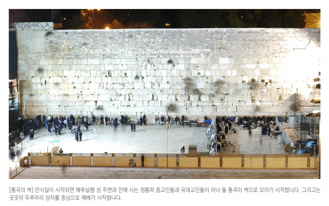 그것이 성서적이냐 아니냐를 떠나서, 저는 오히려 안식일에 일하지 않는 유대인들의 전통이 참 좋습니다. 집 밖으로는 동네를 벗어날 수 없으니, 당연히 안식일은 하나님과 함께 쉬는 날이면서, 동시에 모든 가족이 한 지붕 아래에서 24시간을 보낼 수 있는 날이니 말입니다. 안식일이 시작할 때면 길거리에는 꽃을 파는 사람들을 참 많이 볼 수 있는데, 이것 역시 안식일이 가족 중심이기 때문에 생겨난 풍습입니다. 모든 가장은 안식일에 집으로 돌아가면서 꽃을 사서 가는 거지요. 매주 안식일의 시작에 아버지가 사 온 꽃이 가정의 식탁 가운데에 꽂혀있고, 아버지가 식탁에서 기도를 하면서 안식일 식탁이 시작되는 아름다운 광경. 낚시다 등산이다 친목회 모임이다하면서 가정을 비우고 거나하게 얼굴이 달구어져 들어와 술 냄새를 쿨쿨 피우며 잠자고 있는 아이들에게 입 맞추며 아이들을 깨우기보다는 유대인들처럼 가족과 함께 안식일을 보내면서 어머니, 아버지의 집을 찾아서 3대가 둘러앉아 온 가족이 식탁 앞에서 노래 부르는 광경. 이런 광경들을 한국에서 기대하는 것은 지나친 기대일까요?