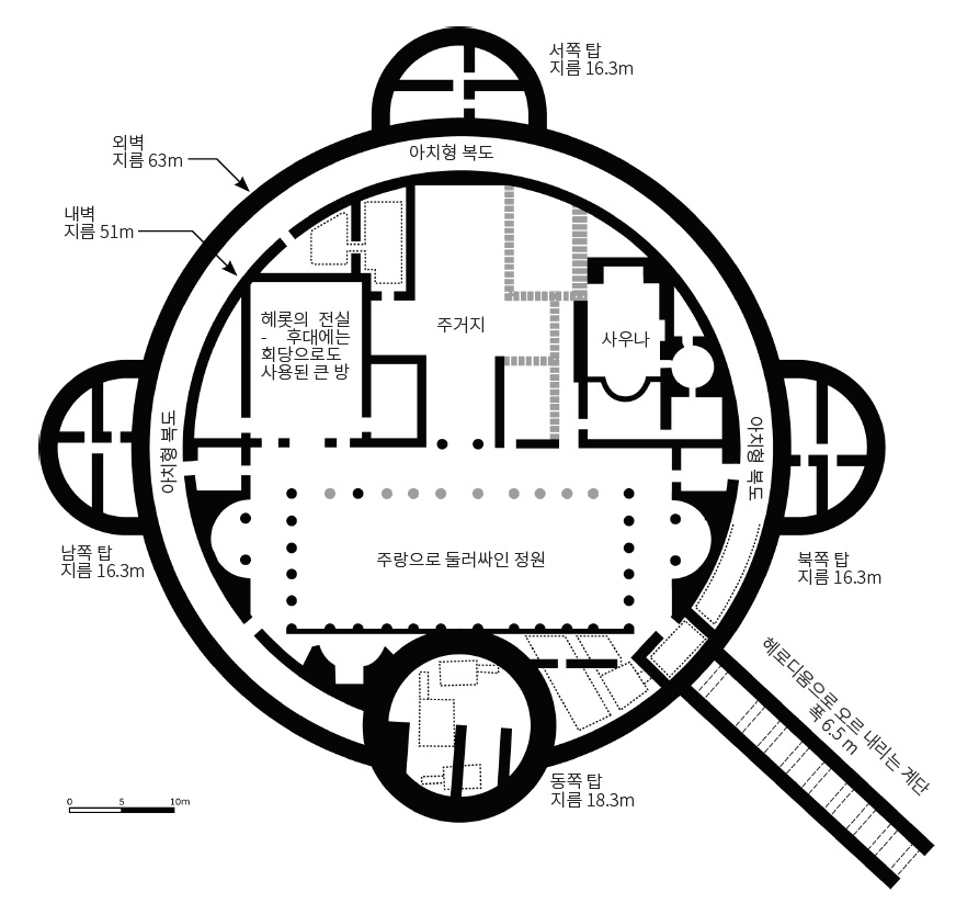 해발 약 740m의 유대 광야 언덕 위에 원형으로 40m 높이의 왕궁 요새를 세웠습니다. 하지만, 아래에서 올려다봐서는 그렇게 멋진 건축물일 것이라고 생각할 수 없습니다. 왜냐하면, 무더운 여름 더위를 피하기 위해서 요새 벽을 따라 흙을 메워 인공 산처럼 만들었거든요. 동그랗게 생긴 요새의 네 귀퉁이에는 두께만으로도 충분히 그 위용을 짐작할 수 있는 망대들과 사우나 시설들, 그리고 이야기를 나눌 수 있는 장소들이 갖추어져 있습니다. 이 원뿔형의 요새의 옆구리에 헤롯 대왕의 무덤이 2000년이 넘는 세월 동안 꼭꼭 숨겨져 있었던 것이지요. 유대인도 아닌 헤롯 왕가가 처음으로 유대인들의 통치자가 된 것은 헤롯의 아버지인 안티파터 (Antipater)의 때 였습니다. 카이사르 (Caesar)의 도움으로 유다 (Judea) 땅의 왕이 된 안티파터가 죽은 후(기원전 43년), 헤롯이 옥타비아누스 (Octavianus)의 도움으로 유다 땅의 왕이 된 거지요 (기원전 37년). 이곳은 헤롯의 아픈 상처가 남아 있는 곳입니다. 헤로디움이 있는 장소에서 기원전 40년에 유대인들이 지지하던 지도자 안티고누스와 헤롯이 전쟁을 벌인 적이 있습니다. 에돔 사람인 헤롯의 통치가 맘에 들지 않았던 유대인들과 파르티아인들이 서로 연합해서 헤롯을 공격한 거지요. 헤롯은 이곳에서 패배했을 뿐만 아니라, 그의 어머니 마저 잃게 됩니다. 그러니 헤롯은 자신의 승전 기념으로 이곳에 여름 궁전을 세운 것이 아니라, 자기의 패전을 잊지 않기 위해서, 더욱이 전쟁에서 죽은 어머니를 기념하기 위해서 이곳에 이토록 멋진 건축물을 남겼는지도 모를 일입니다. 헤롯에게 매우 중요한 의미를 지닌 이 도시를 얼마나 사랑했는지는 헤롯이 죽은 후에 예루살렘에 묻히지 않고, 이곳 베들레헴 남동쪽의 헤로디움에 매장되었다는 것을 보아도 금세 알아차릴 수 있지요. 아마 어머니가 죽은 곳에서 나도 함께 묻히고 싶다는 효심(?)에서 비롯된 것일 수도 있고요.