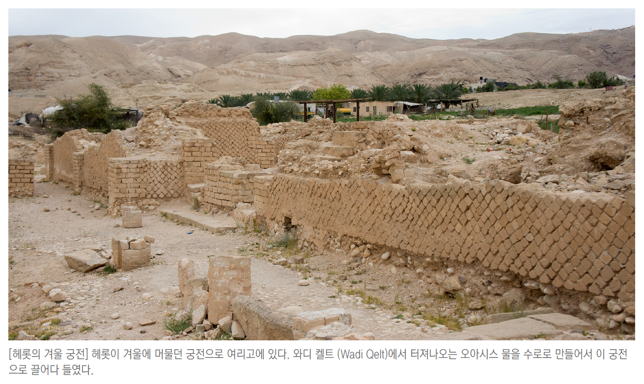 그러고 보면 헤롯도 참 인간적이지요? 예루살렘 성전의 웅대함, 빌라도의 법정으로 알려진 안토니아 요새, 지금도 유대인 구역에 그 일부가 남아 있는 헤롯의 궁전 터(일각에서는 제사장의 집이라고도 합니다), 발견되지는 않았지만 요세푸스가 말하고 있는 예루살렘의 거대한 극장과 연설장, 사마리아에 남아 있는 아우구스투스를 위한 멋진 건축물과 법정, 그리고 두터운 성벽, 지중해 해변에 세워진 거대한 로마식 도시 가이사랴의 원형극장과 경기장, 요새와 방파제, 가이사랴로 연결되는 8 킬로미터의 수로, 유대광야 한가운데 세워진 난공불락의 요새 마사다와 광야의 길목마다 세워진 요새들, 예루살렘 인근의 오아시스에서 여리고로 흘러들어가게 하는 긴 수로들과 베들레헴에서 예루살렘 성전으로 흘러들어가는 물길, 아름다운 헤로디움, 유대 광야에 만들어져서 아직까지 지프차의 도로와 군사용 도로로 사용되고 있는 도로들, 이처럼 웅장한 토목 공사들의 공통점이 뭔지 아세요? 헤롯이 만들었다는 겁니다. 역사를 말할 때에, “만약에 … 였다면” 이라는 말은 사용하지 않는 말이라고들 하지만, 만약에 이스라엘의 역사 가운데에서 헤롯이 없었다면, 오늘의 이스라엘의 모습은 전혀 다른 모습이었다고 저는 확신합니다. 당대에 주변 국가와는 견줄 수 없는 웅대함을 자랑했던 유대아를 어떻게 헤롯과 별개로 생각할 수 있겠습니까?