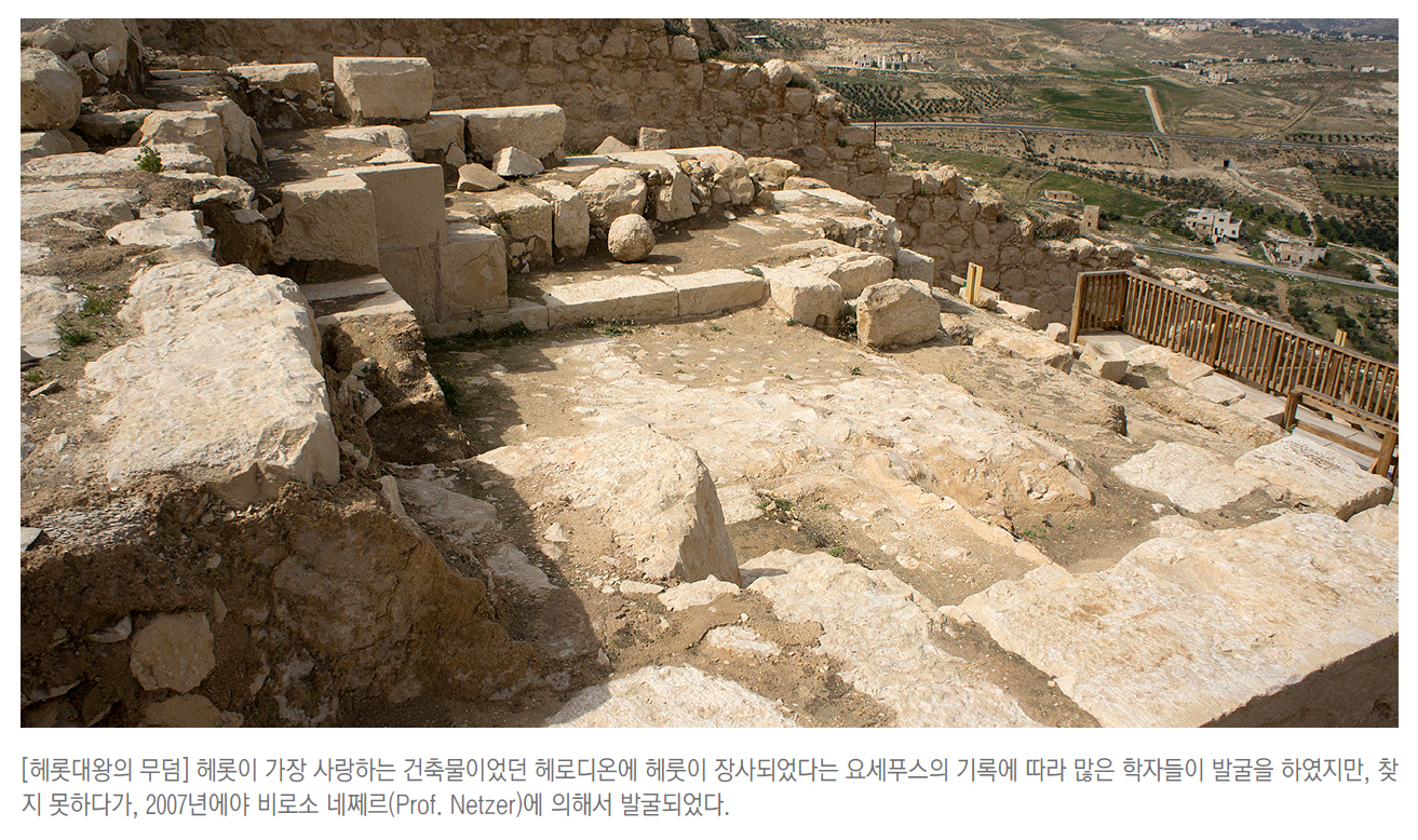 헤롯의 무덤이 발견이 되었다고 난리들입니다. 베들레헴 인근에 헤롯이 만들어 놓은 가장 대표적인 걸작품인 헤로디움에서 헤롯의 무덤이 발견되었습니다. 헤로디움은 헤롯의 여름 별장지로 유명한 곳입니다. 헤롯이 건축한 건축물 중에서 유일하게 자기 이름을 따서 이름붙인 장소이기도 하지요. 그만큼 헤롯이 공을 들이고, 사랑했던 곳이라고 말할 수 있습니다. 2만 평이나 되는 대지에 현대의 도시에서나 볼 수 있는 정방형의 구획들로 잘 준비된 도시 계획에 따라, 건물들이 오밀조밀하게 구성되어 있는 헤로디움을 보면, 가히 옛 사람들의 토목기술이 얼마나 정교하고 대단했는지를 짐작할 수 있습니다. 이 헤로디움의 가장 아름다운 곳은 산 위에 세운 원형 요새입니다.