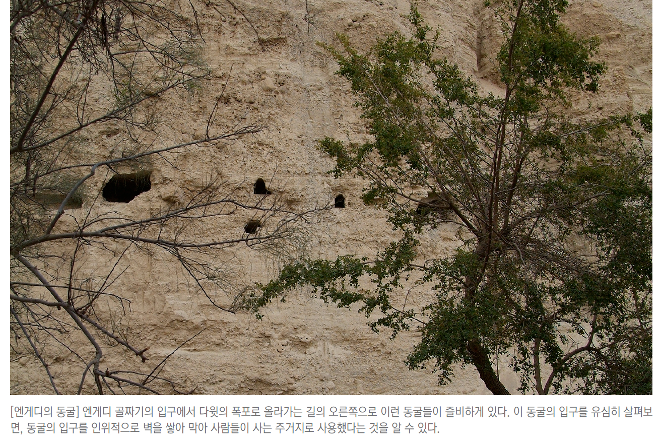 국립공원 엔게디 עין גדי 는 유대 광야 한 가운데에 쏟아지는 신선한 오아시스가 있는 곳입니다. 국립공원에 들어서자마자 안쪽으로 들어가다 보면, 오른쪽의 골짜기로 푸릇푸릇 풀들이 돋아나있고, 그 절벽의 이곳저곳은 사람이 파 놓은 듯, 저절로 생긴 듯, 많은 동굴들이 있어요. 그 동굴들을 잘 보면, 원래 자연적으로 생긴 동굴에 사람의 손길을 불어 넣어 주거의 장소로 이용하였다는 것을 알 수가 있습니다. 그 절벽의 동굴에 어떻게 사람이 살았을까 싶을 정도로 올라가는 길이 가파른 동굴은 이미 몇 천 년에 걸쳐서 사람들이 살았던 주거지입니다. 엔게디 국립공원에 들어서면, 가장 먼저 생각나는 성서의 사람은 다윗입니다.