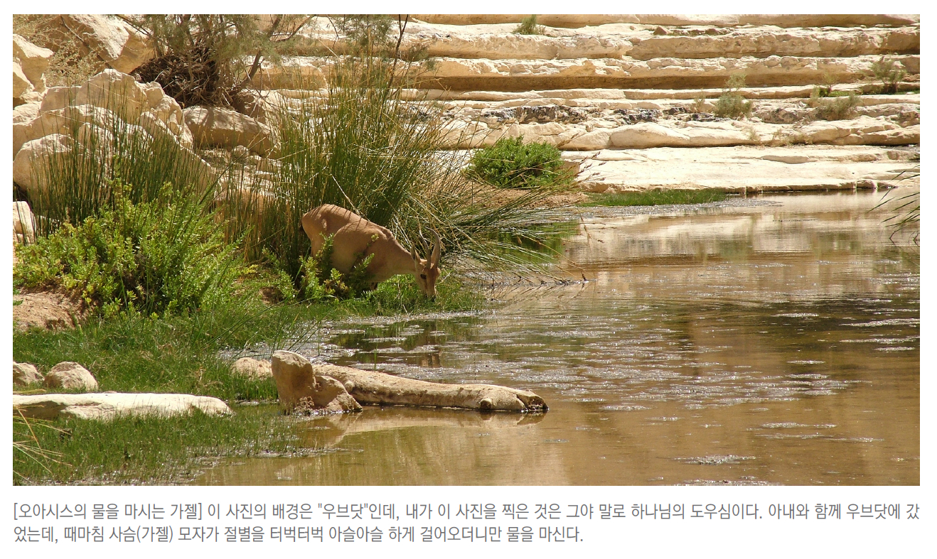 사슴이 난리가 난 거지요. 이 헐떡거리는 사슴이 말라버린 샘 앞에서 펄쩍펄쩍 뛰면서 '아이고 나 죽었다'를 연발하고 있는 모습을 상상해 보세요. 그런 사슴을 생각하면서 시편의 시인은 그런 사슴의 처지가 바로 자기의 처지라고 말하고 있습니다. 아마 이 시편을 기록한 시인은 매우 곤란한 상태에 빠졌던 모양입니다. 엔게디에서 이 시편을 묵상하노라면, 또다시 어김없이 다윗이 생각납니다. 사무엘으로부터 왕으로 추대되어 기름부음을 받은 다윗은 분명히 승승장구해야 했습니다. 그런데 그때부터 다윗은 사울에게서 생명의 위협을 받으며 광야를 전전하며 숨어 다닙니다. 그런 다윗을 보면서 분명히 사람들은 이렇게 말했을 겁니다. "다윗아 네 하나님이 어디에 있느냐?" "하나님은 너를 버리셨다!" 다윗도 사람인지라 그 지경에 빠져서 헤어날 길이 없으면, 하나님을 원망할 만도 했을 텐데, 다윗의 삶을 들여다보면 저처럼 신앙이 조건적이지는 않았던 것같습니다.