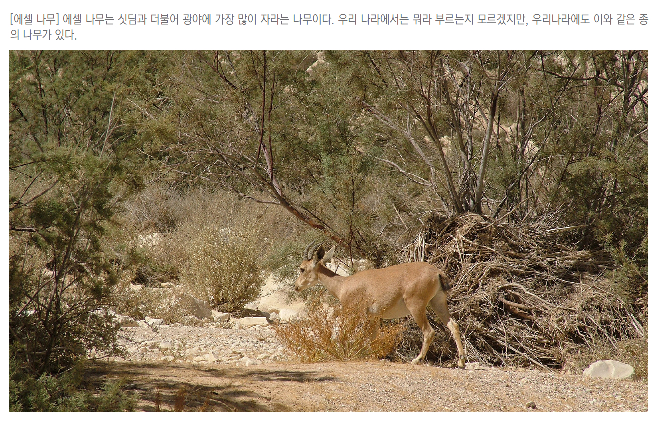 다음날 아침, 한 여자 권사님께서 제게로 와서 "에셀나무는 어떻게 생겼어요? 우리가 가는 길에 볼 수 있나요?" 하고 물어 보셨습니다. 어제 하루 온종일 모른다고 했는데, 오늘 마저도 또 모른다고 하면, 더 이상 저를 못 믿을 것 같다는 생각도 들고, 이러다가 잘리는 것은 아닌가하는 생각도 들고, 별의별 생각이 다 들더라고요. 안되겠다 싶어서 이스라엘에서 성지순례 안내만 10년을 넘게 해 오신 집사님께 전화를 드렸습니다."어, 이 전도사(막역한 사이임). 에셀나무? 지금 어디인데? 그래? 문제없어! 엔게디 필드 스쿨에 들릴 거지? 들어가자마자 두 번째 나무야."