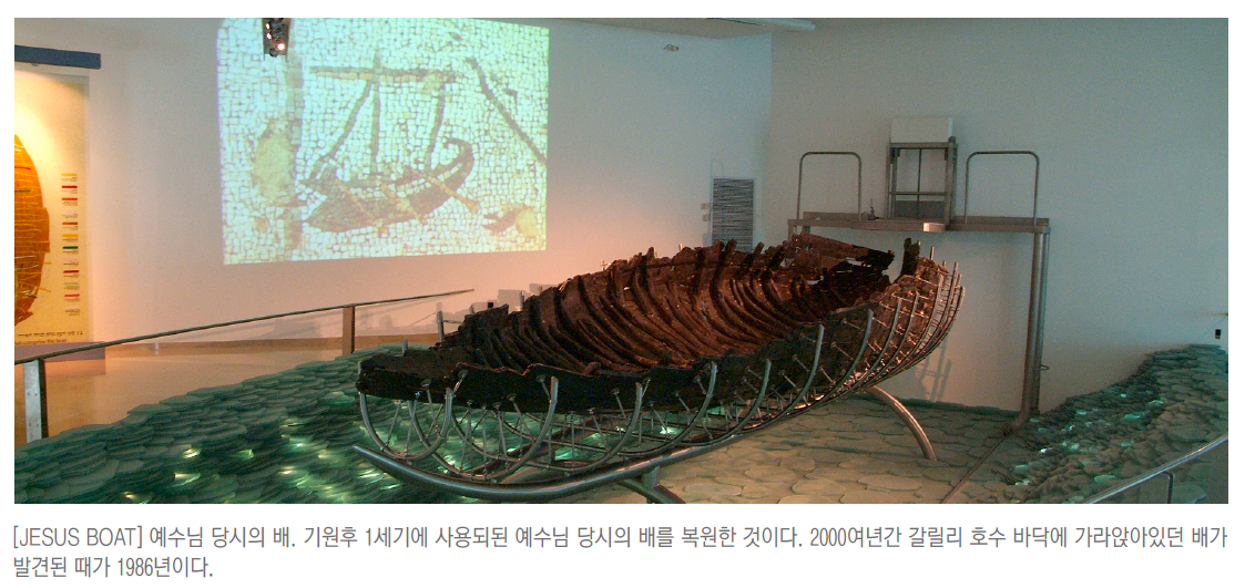 모세와 유발이라는 두 형제가 "긴노사르"라는 키부츠에 살고 있었습니다. 어부인 이 두 형제는 호숫가에 나갔다가 물 아래에 마치 배 모양의 검은 그림자를 보았지요. 곧바로 경찰에 먼저 신고를 했답니다. 무언가 수상쩍으니 말이지요. 전문가들에 의해서 이것이 고대 배의 조각이라는 것이 밝혀지고, 키부츠 긴노사르의 사람들과 이스라엘 고고학 유물당국, 그리고 이 배와 관심을 가진 많은 자원봉사자들이 이 배를 인양하는 작업에 들어갑니다. 그리고 12일 밤낮에 걸친 작업으로 드디어 이 배가 그 모습을 드러내게 되지요. 길이 8.2미터에 폭이 2.3미터, 그리고 높이가 1.2미터가 되는 이 배의 나이는 약 기원전 100년에서 기원후 70년에 이르는 것으로 판명이 되었습니다. 정확히 예수님의 시대와 맞아 떨어지지요. 약 15명의 사람들이 오를 수 있는 이 배의 용도는 알 수가 없습니다. 어떤 사람들은 이 배가 갈릴리의 어부들이 타던 배라고 주장하고, 어떤 사람들은 이스라엘의 반 로마항쟁 때에 침몰한 군인들의 배일 것이라고 추측하기도 합니다. 어느 말이 정답인지는 알 수 없지만, 하여간에 이 배가 예수님 당시의 배이고, 당시의 사람들이 타던 배의 모습과 별반 다를 것이 없다는 것만은 확실합니다. 게다가 마태복음에서도 말하고 있듯이 예수님과 제자들이 모두 함께 오를 수 있는 배였다면, 적어도 이 배만하거나 이 배보다 약간 더 큰 배가 아닐까합니다. 지금도 키부츠 긴노사르에 가면, 이 배의 실물을 그대로 볼 수 있답니다. 이 배를 보고나서는 마태복음 8:24의 말씀에 더욱 의심이 생기더란 말입니다. 이 배가 어떻게 호수의 물살에 뒤집힐 수 있냐는 거지요.
