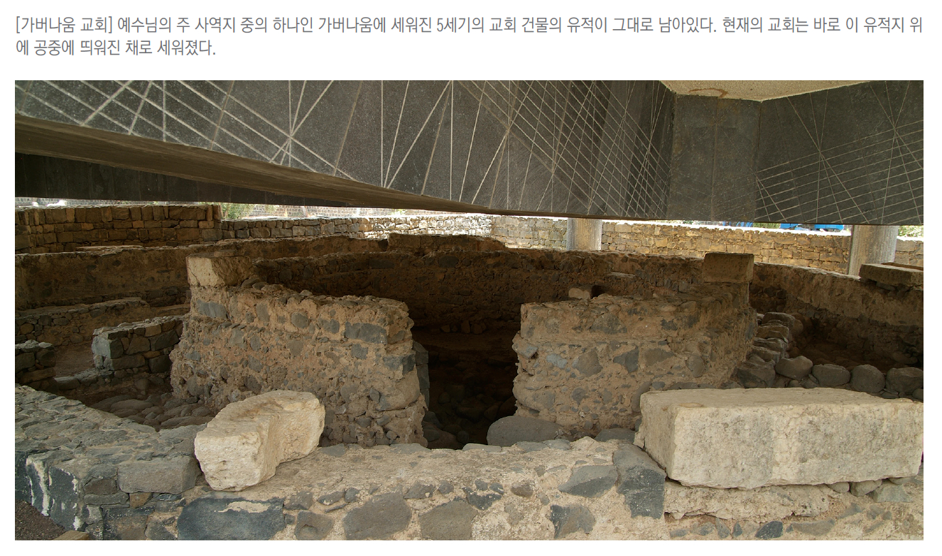 그리고 새로 공중에 띄운 교회에 계단을 통해서 올라가면, 그 한가운데가 텅 비어 있는데, 그 공간의 바닥을 유리로 만들어서, 유리 아래로 옛 교회의 모습을 그대로 볼 수 있습니다. 5세기의 교회가 베드로 장모의 집 위에 세워진지라, 옛 교회의 터 아래에는 또다시 베드로 장모 집터의 흔적들을 볼 수 있는데, 처음으로 그 집터를 보았을 때에 얼마나 가슴이 뭉클했는지 모릅니다. 열병에 걸린 베드로의 장모가 아직도 누워있는 것 같고, 지금 막 예수님께서 베드로의 장모를 고쳐주시는 것 같더라고요. 우리 신앙의 아버지들은 이곳에서 예배를 드렸을 것이고, 아마도 예수님에 대한 복음을 입에서 입으로 전해 주었을 거예요. 바로 이 자리에서 말이지요. 그리고 그 자리에 지금 제가 서 있는 겁니다!