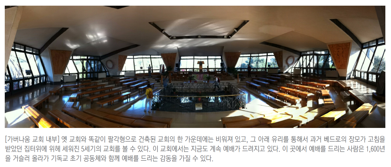 그런데 새로 건축한 이 교회가 가히 예술입니다! 이 교회는 옛 가버나움 마을의 회당 옆에 있는데, 교회가 공중에 떠 있습니다. 교회가 무슨 자기 부양술이라도 가졌겠습니까? 그것은, 역시 건축 설계자의 옛 것에 대한 배려였습니다. 5세기에 세워진 교회의 그 크기 그대로 교회를 다시 그 자리에 새로 건축하려니, 옛 교회의 터를 파헤쳐야 하는 것은 당연한 이치인데, 이렇게 중요한 기독교의 문화유산을 "신축"이라는 이름으로 없애는 것이 무척 안타까웠던 모양입니다. 그래서 팔각형의 교회의 여덟 모퉁이에 기둥을 세워서 그 기둥 위에 교회를 얹어 놓는 기발한 방법으로 옛 교회의 터 위에 교회를 붕 띄워 놓은 것이지요. 옛 교회를 그대로 살리고, 그 자리에서 오늘의 교인들이 예배를 드릴 수 있는 터를 만들어 놓은 것이지요.