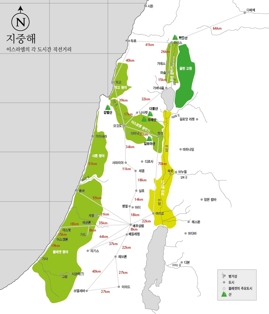 자주 질문 받는 것 중의 하나는 도시간의 거리가 얼마가 되냐는 것입니다. 도시와 도시를 연결하는 도로의 길이를 정확히 알지는 못하지만, 적어도 도시간의 직선거리를 알게 된다면, 성경에 나오는 그 수많은 사람들은 얼마의 거리를 걸어서 도시에서 도시로 이동했는지, 예수님께서는 얼마나 걸어다니셨는지 알 수 있을 것입니다.
