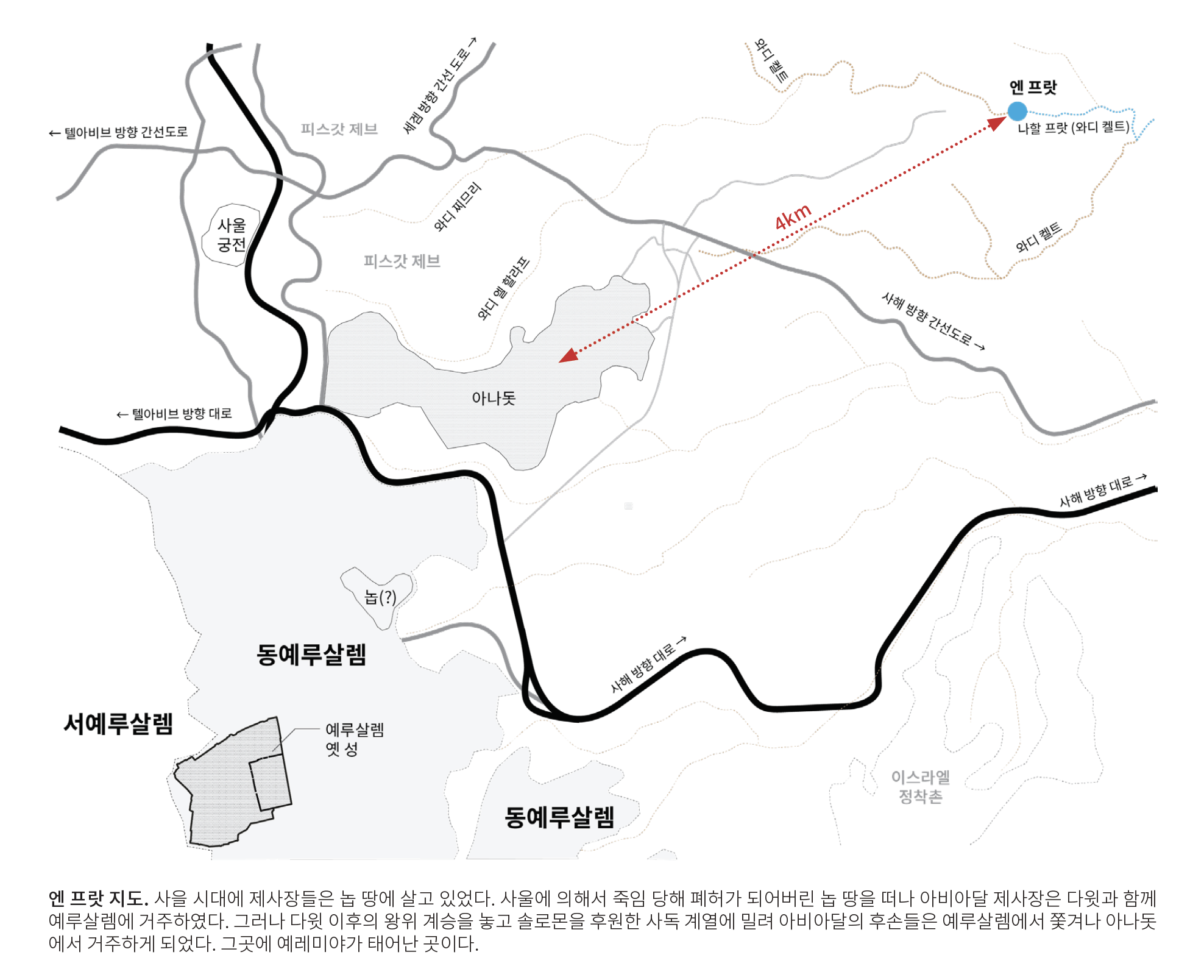 ‘엔 프랏’ (Ein Perat)은 아나돗이라는 마을로부터 약 4킬로미터 떨어져 있는 오아시스입니다. 와디 켈트 (Wadi Qelt)라고 불리는 건천이 예루살렘 북쪽에서 여리고로 내려가는데, 예수님 당시에 길로 사용되던 이 건천(와디 wadi)을 따라 내려가다보면 세 개의 오아시스가 나옵니다. 그 중에서 예루살렘 가까이, 가장 높은 곳에 있는 오아시스가 엔 프랏입니다. 건천을 따라 흐르는 물 줄기가 여리고까지 흐르는데, 이 물줄기를 프랏 강 (Nahal Perat, ‘나할 프랏’) 이라고 부르기도 합니다.