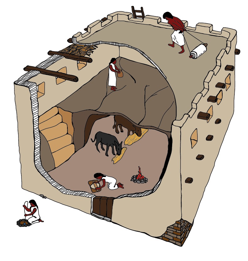 위의 그림에서 보듯, 아래층은 마굿간이 있고, 위 층은 주거공간으로 사용됩니다. 이렇게 아랫층에 마굿간을 만들어 놓는 이유는 우기 (겨울)에 난방의 문제를 해결하기 위해서 이지요. 우리가 잘 알다시피, 뜨거운 공기는 위로 향하게 되어 있습니다. 그러니, 아래층에 마굿간을 놓게 되면, 우리나라의 구들처럼 뜨끈하지는 않을 지라도, 동물들의 체온이 자연스럽게 위로 올라가 공기를 데워줄 수 있습니다. 매우 지혜로운 방식이라고 할 수 있습니다.