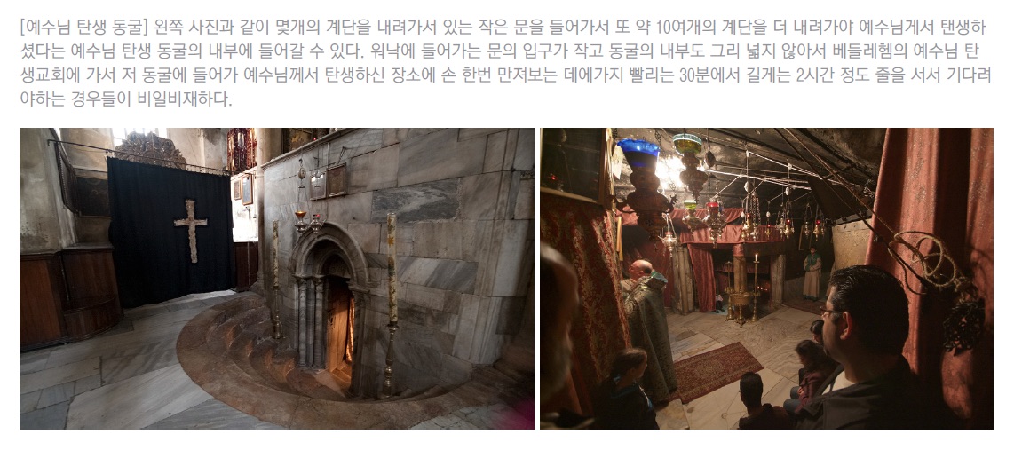 베들레헴의 예수님 탄생교회를 가보면, 적지않게 당황하는 것 가운데 하나가 예수님께서 탄생하셨다는 교회 지하의 동굴입니다. 교회의 모양은 번듯하고, 교회에 들어가서는 제일 먼저 사방을 두리번 거리면서 어디가 예수님 태어나신 곳인가를 찾게 되는데, 정작 교회에는 예수님 탄생하신 곳을 찾아볼 수 없고, 교회 정면의 제단 아래의 동굴로 내려가야 예수님께서 탄생하셨다는 장소에 이를 수 있기 때문입니다.