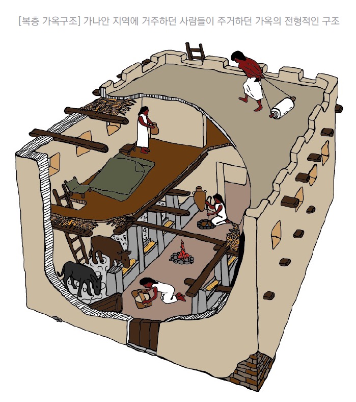 그러나, 경제적인 여유가 없는 사람들의 경우는 다릅니다. 복층 구조의 건물을 만들기 위해서는 나무들도 많이 필요하기 마련인데, 광야 지역에서 나무가 많이 들면 많이 들수록 비싼 건물일 수 밖에 없으니 말입니다. 게다가 이층으로 올리기 위해서는 천정을 받쳐주는 돌기둥도 필요한데, 그것 역시 만만치 않은 가격이었을 것입니다. 그래서 경제적인 여유가 없는 사람들이거나, 나무가 많지 않은 지역에서 이층으로 건물을 올리는 일반적인 방식은 자연적인 동굴을 이용하는 것이었습니다. 자연동굴을 건물 벽 안쪽으로 넣어서 저절로 2층이 생기게 하는 방법인데요. 이렇게 자연적인 동굴을 이용하면서도 Four Room House의 구조를 지킬 수 있습니다. 동굴의 위쪽 사람들이 거주하는 공간에 벽을 쌓아서 방의 구분을 만들 수도 있고, 동굴 안쪽에도 벽을 만들어서 마굿간과 창고로 따로 따로 이용할 수 있으니 말입니다.
