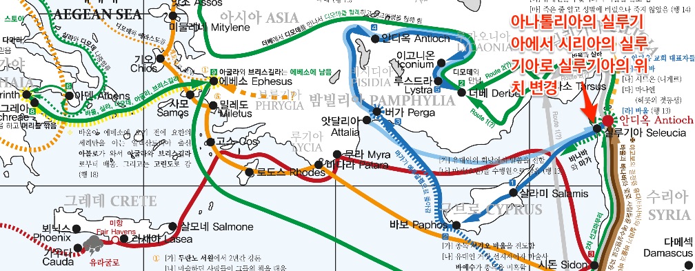 아래에 댓글을 달아주신 송창섭 목사님의 코멘트를 참고로 다시 주석책을 뒤져보니, 바울 당시 적어도 3개의 실루기아 Seleucia가 있다는 것을 확인했습니다. 저는 아나톨리아에 있는 실루기아 (바울의 고향이 다소와 가까운)를 지났을 것이라고 생각하고 그렇게 표기를 했는데, 찾아보니, 안디오의 서남쪽에 있는 시리아의 실루기아 항구를 통해서 바울이 제1차 선교여행을 떠난 것으로 모두들 설명이 되어 있더군요. 그래서 실수를 정정해서 다시 파일을 올립니다. 이미 다운을 받으신 분들께는 죄송하다는 말씀을 드립니다. 그리고 송창섭 목사님께 감사의 말씀을 드립니다.