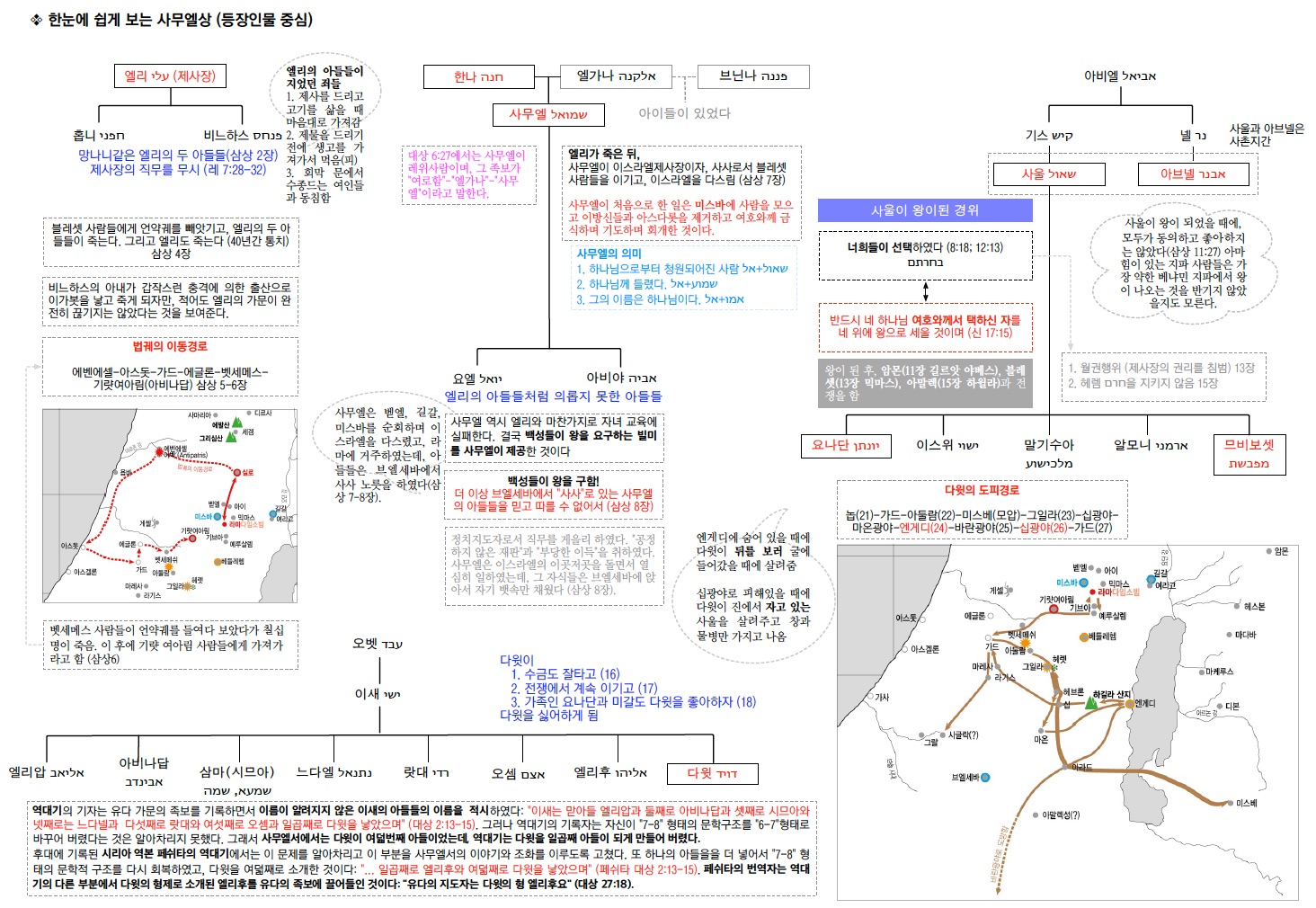 지도로보는 사무엘상 과 함께 이번에는 사무엘상을 등장인물을 중심으로 정리해 보았습니다. 사무엘상을 어떤 식으로 이해하고 성경을 보는가, 또는 설교를 하는가에 따라서 여러가지 다른 각도로 사무엘상을 읽을 수가 있을텐데요. 이번에는 주요한 등장인물만 추려서 보시면, 이해하시는데 조금 더 도움이 되지 않을까합니다. 업로드는 보시기에 편하시도록 A3 크기로 했습니다.