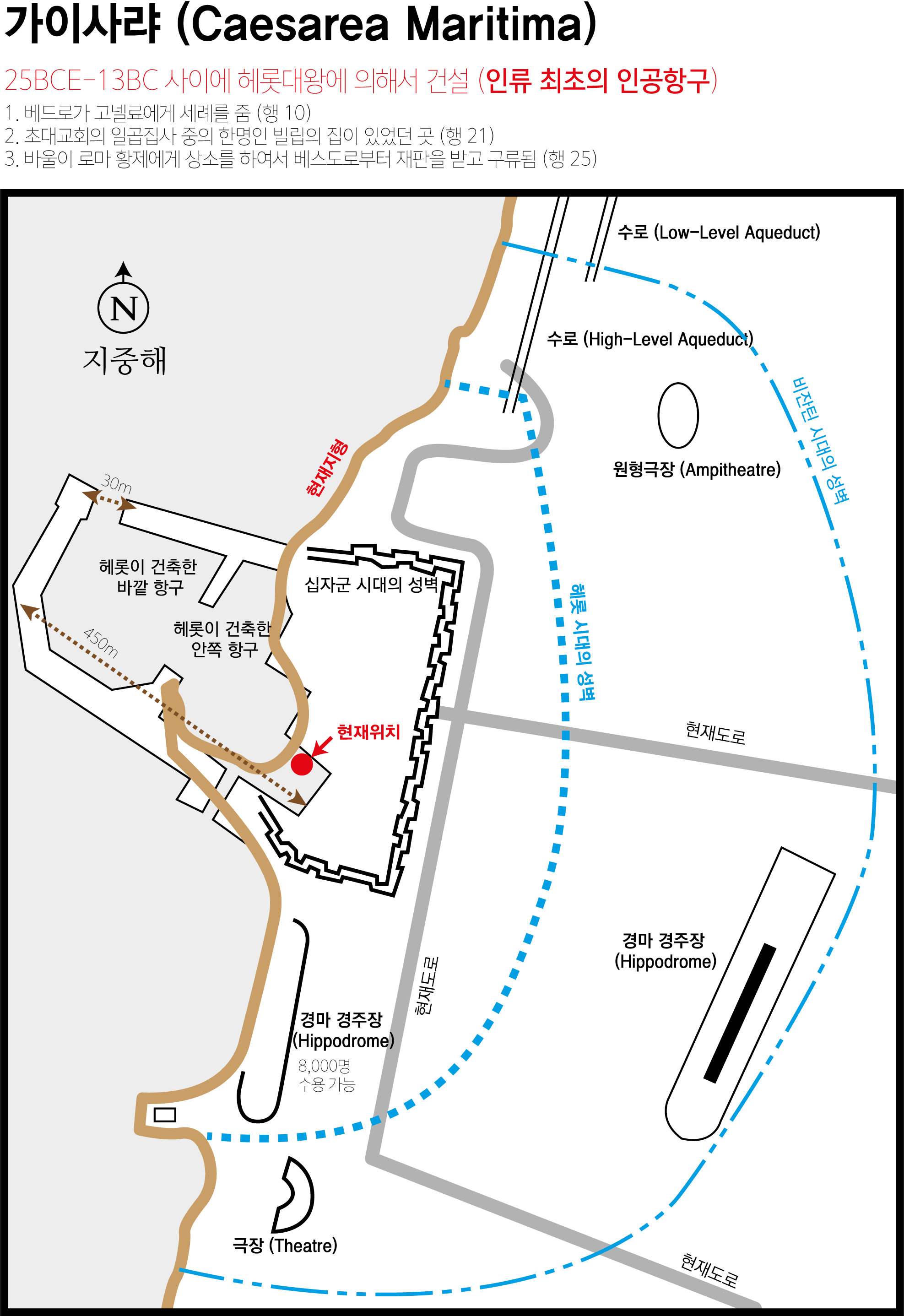 바울 선생님께서 선교여행을 떠나실 때에, 늘 지나가셨던 가이사랴 항구의 지도입니다.