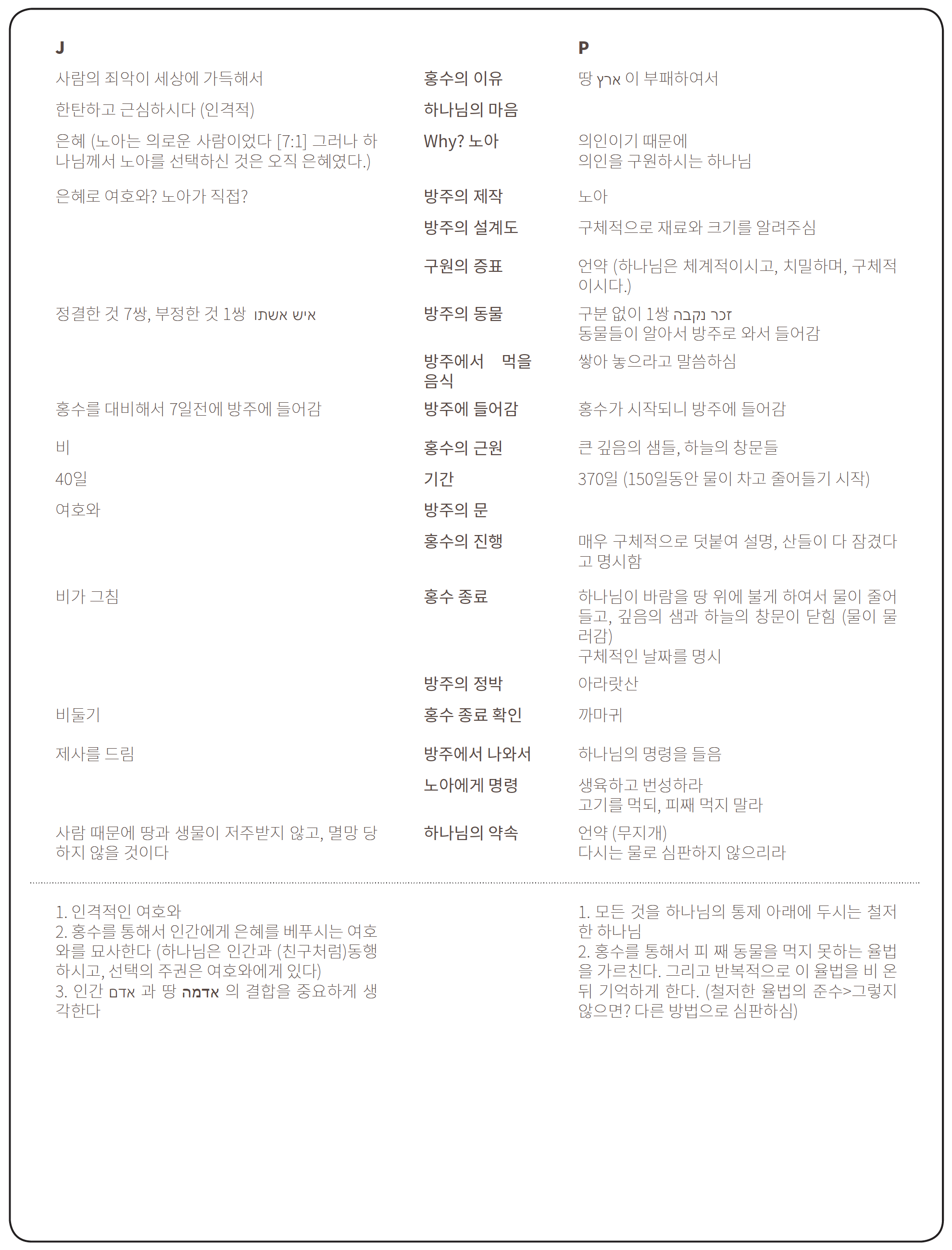문서설의 입장에서 본 노아의 홍수이야기는 J의 홍수 이야기와 P의 홍수 이야기가 서로 합쳐진 것입니다. 서로 독립적으로 (구전과 글로) 전해져 내려온 두 개의 홍수 이야기들이 후대 "창세기(베레쉬트)"라는 두루마리로 기록될 시기에 하나로 합쳐졌는데, 이렇게 합쳐진 두 개의 이야기(전통)을 다시 구분해서 각각의 이야기의 원래 형태를 추론하고, 원래의 이야기를 품고 있었던 공동체가 가지고 있었던 하나님을 향한 신학을 찾아보는 작업이 문서설에 근거한 성서연구 방법입니다.