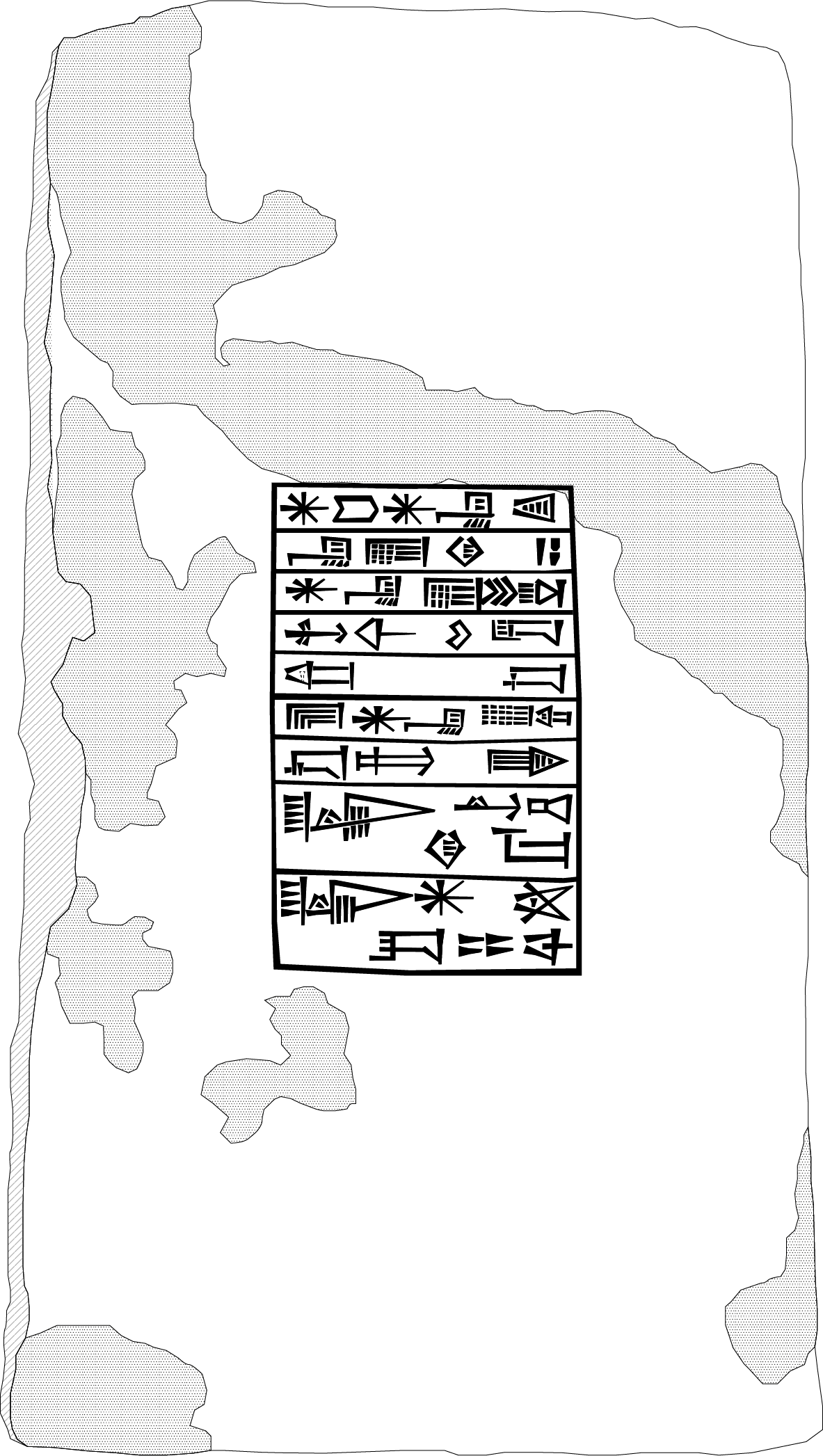 “아마르-신, 니푸르(Nippur 도시 이름)의 신인 엔릴의 이름으로 부름 받은 자, 우르의 위대한 왕, 네 지역을 다스리는 왕, 그가 사랑하는 주인 엔키(Enki 마실 수 있는 물의 신이자 에리두 도시의 신)와 압수(Apsu 깊은 땅 속의 물을 다스리는 신)를 위해서 신전을 세우다.”
