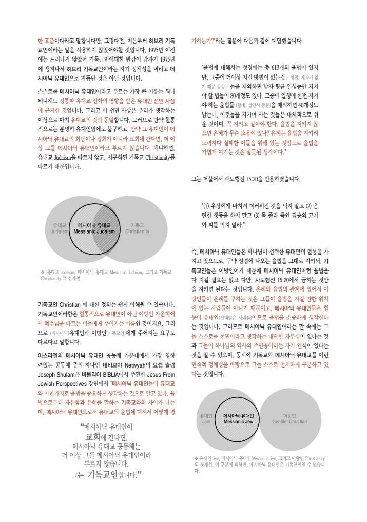 한국 교회에 알려진 일부의 이야기에서는 메시아닉 유대인들이 스스로를 기독교인이라는 말을 사용하지 않는 이유가 기독교인들에게 받았던 유대인들의 박해의 역사에서 드러난 반감에 대한 표출이다라고 말합니다만, 그렇다면, 처음부터 히브리 기독교인이라는 말을 사용하지 않았어야할 것입니다. 1975년 이전에는 드러나지 않았던 기독교인에대한 반감이 갑자기 1975년에 생겨나서 히브리 기독교인이라는 자기 정체성을 버리고 메시아닉 유대인으로 거듭난 것은 아닐 것입니다.