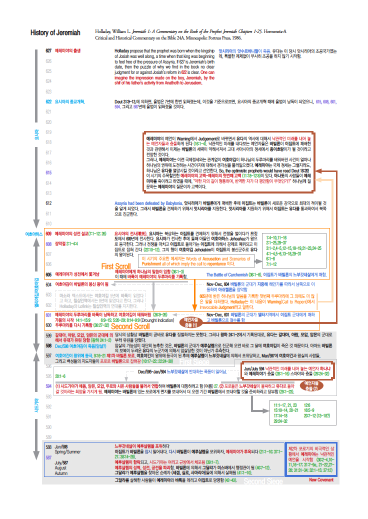 예레미야의 활동과 예언에 대한 시대적인 배경을 줄 수 있는 연대표를 A4용지 한장 크기로 구성해 보았습니다. 예레미야의 예언의 변화와 왜 그런 예언, 그리고 왜 그런 갈등들이 있었는가를 이해하는데에 도움이 되리라 생각됩니다.