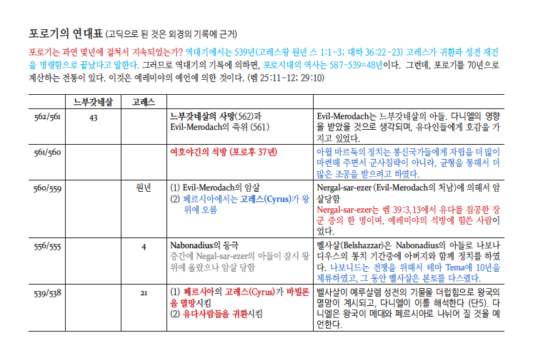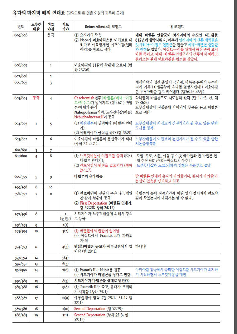 여기에서는 유다의 마지막 시기와 포로기의 연대기를 따로 정리해 보았습니다. 그리고 포로기에 일어난 사건들에 대해서도 정리해 보았습니다. 정리하면서 보충 자료들을 넣는대로 계속 업데이트 하겠습니다. 그리고, 이 연대기는 위에 링크된 연대기와 함께 보시면 더 도움이 됩니다.
